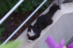 Eigentlich hat er mir's ja verboten, aber gestern hab' ich mir einen Mauersegler geschnappt! Und der Jürgen hat es nicht mitbekommen. Ich werde ihm auch nicht verraten, wie ich das geschafft habe. Das Wetter war schön und er hatte sich - der Jürgen natürlich - mit Ohrhörern in den Ohren, ein schattiges Plätzchen auf der Terrasse gesucht. Später ist er dann auf den Balkon - immer noch mit Kopfhörer Musik aus dem Internet hörend - irgend so einen Bluessender. In der Zeit bin ich mit meinem Opfer rein und die Kellertreppe runter. Und als wenn er es geahnt hätte; Irgendwann hat er sich wohl gedacht, dass er mal nach mir schauen müsse. Er kuckt die Kellertreppe runter.